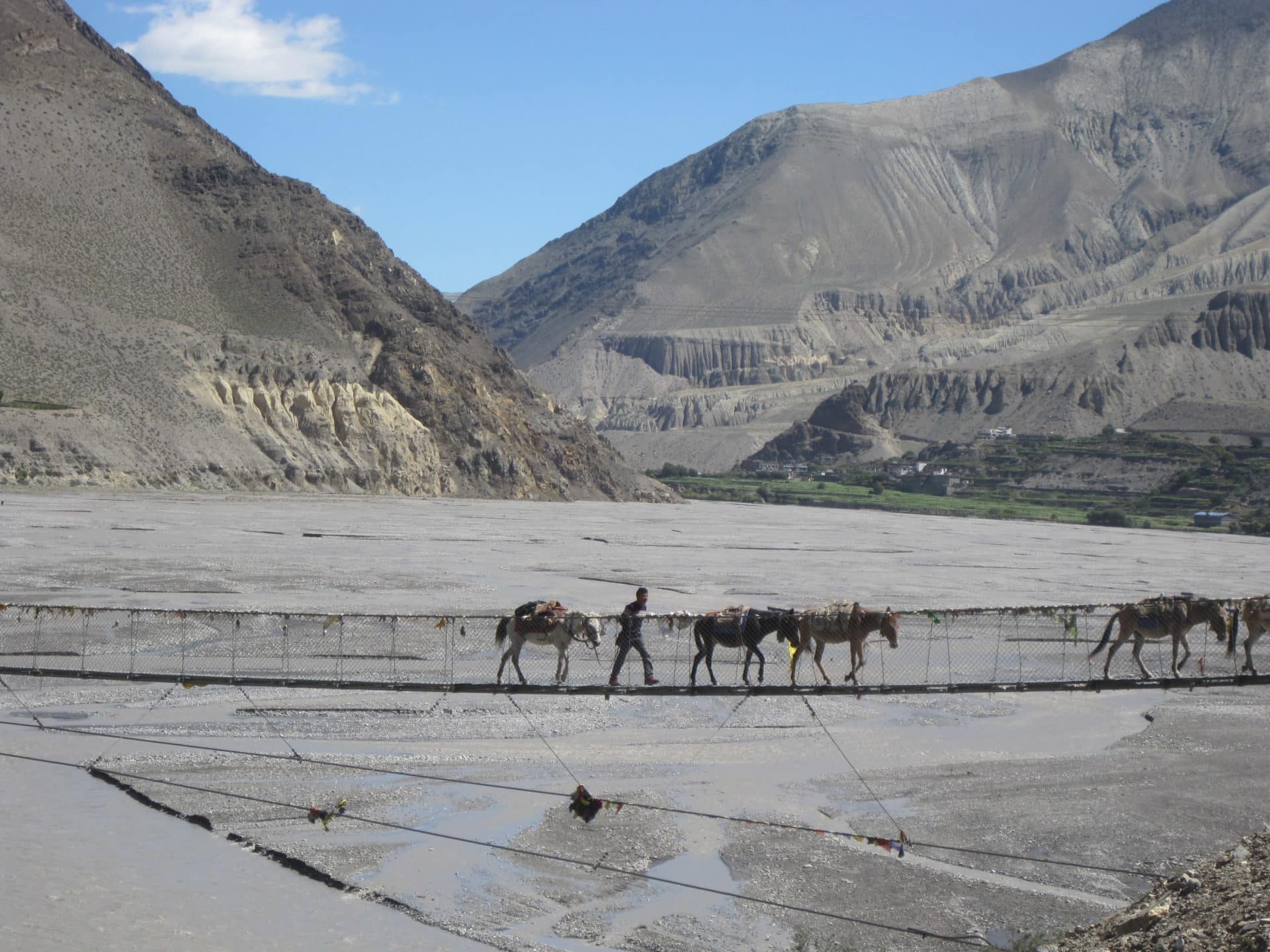 Wir starten unseren Trek und halten uns heute in nördlicher Richtung, immer am Ufer des Kali Gandaki entlang. Der Fluss, zwischen Annapurna und Dhaulagiri gelegen, bildet das tiefste Durchbruchstal der Erde: der tiefste Punkt liegt auf 2.550 m, der Höhenunterschied zum Gipfel des direkt benachbarten Dhaulagiri beträgt über 5.600 Meter.