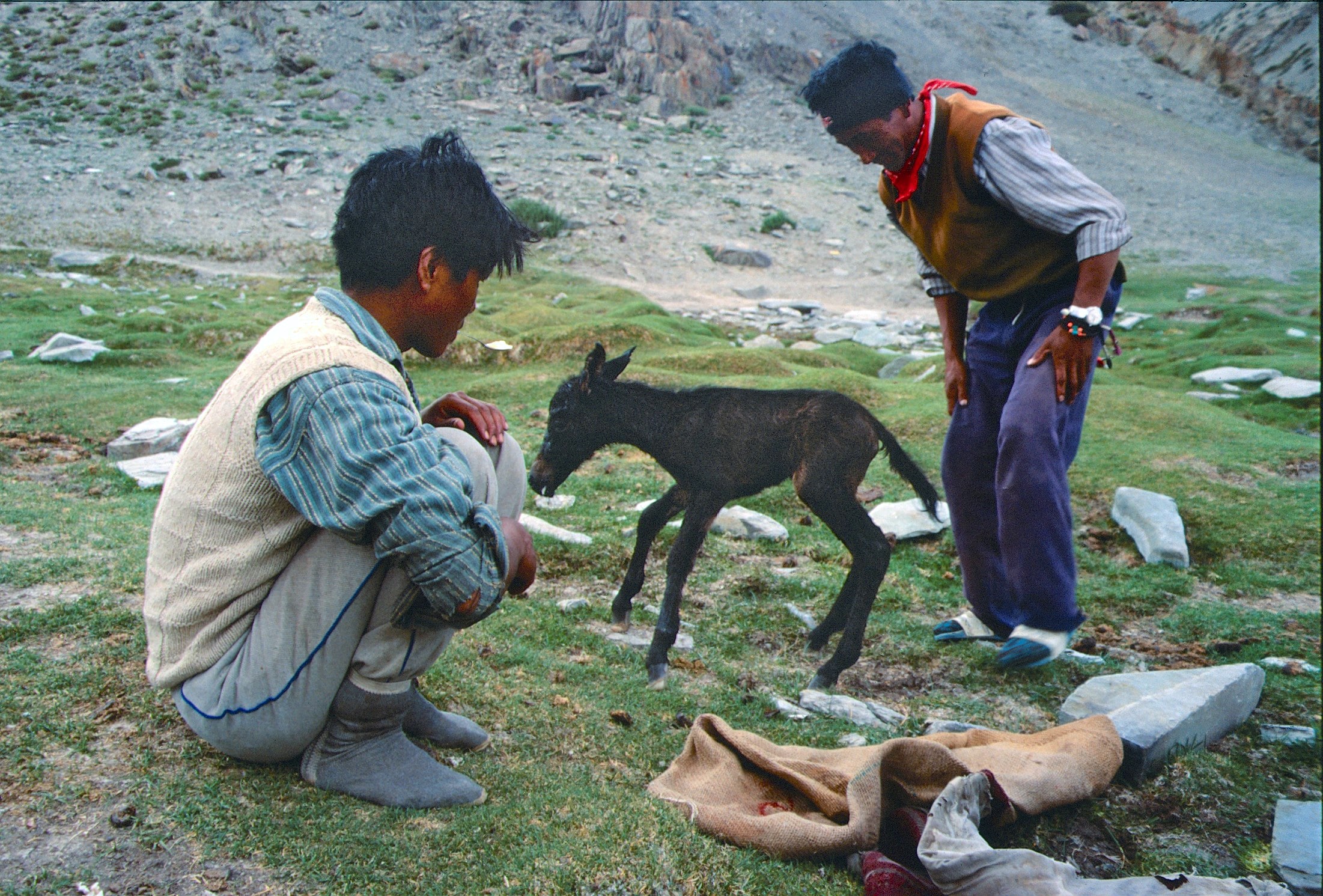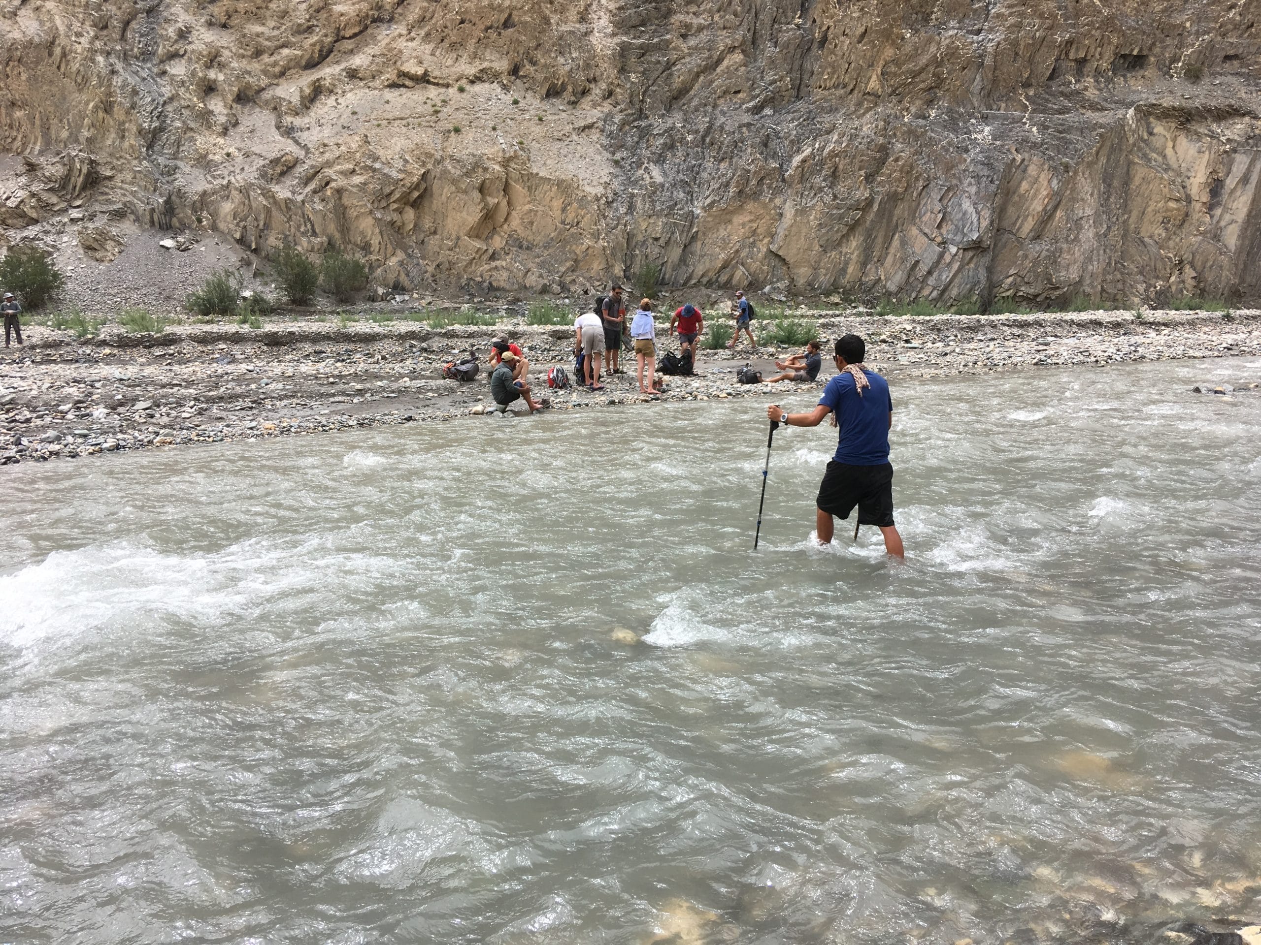 Dann geht es aus dem Indus-Tal zunächst durch grüne Tallandschaft, dann über wilde Schluchten und hohe Pässe hinauf bis zu den 5000 m hoch gelegenen Yak-Weiden von Nimaling. Zahlreiche Flussdurchquerungen sind unvermeidbar und machen den Trek zum Abenteuer. Immer wieder erhaschen wir Blicke auf die Sechstausender Dzo Jongo East Peak (6214 m) (siehe T502) sowie den benachbarten Kang Yatze (6400 m).