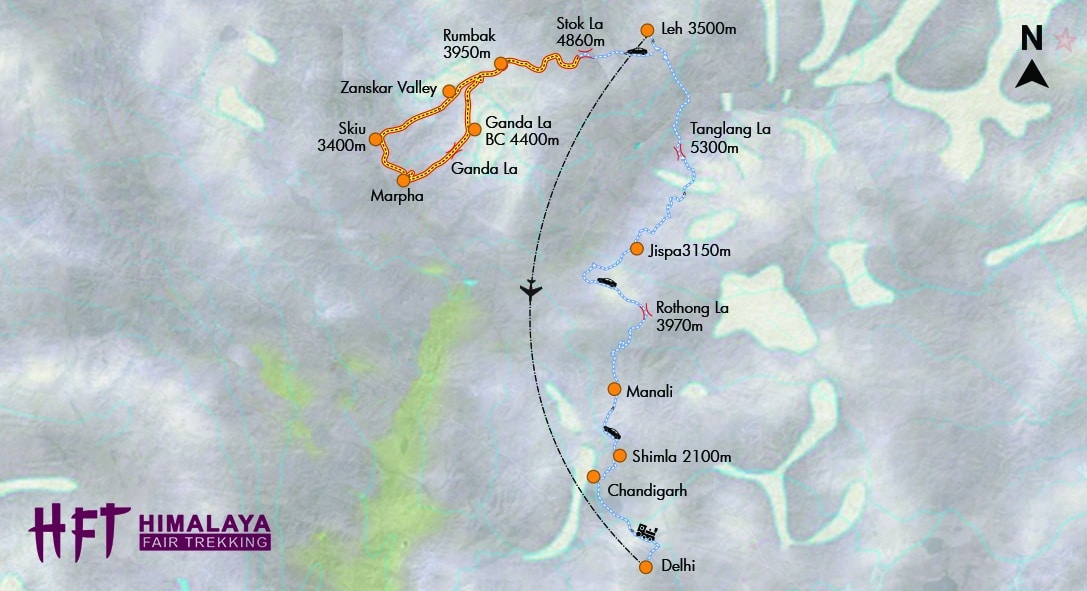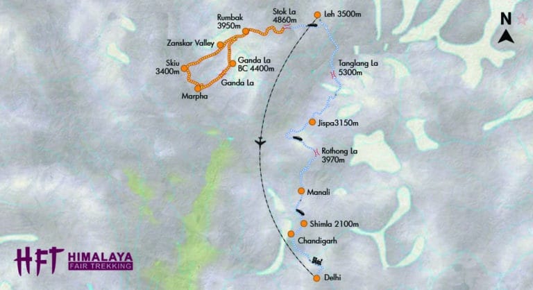 Über den Ganda La (4980 m) hinunter ins Markha-Tal nach Skiu (3400 m). Rückfahrt über Chilling durch das Zanskar Valley nach Leh, ÜN im Hotel